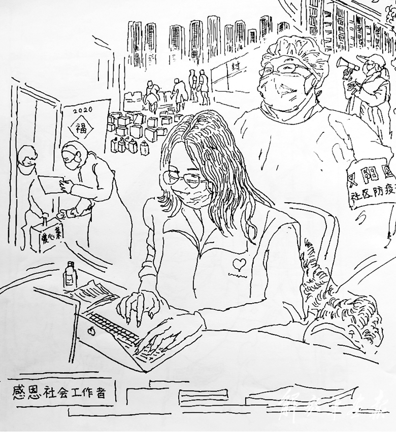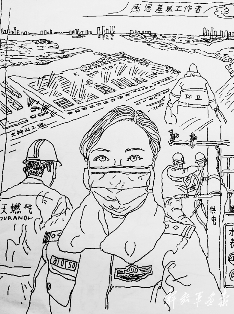 因為身邊沒有繪畫工具,馬國旗就使用鋼筆和復(fù)印紙這兩樣簡易工具,創(chuàng)作抗疫題材速寫作品。2個月來,他創(chuàng)作了近百張速寫畫,這些作品題材豐富,主題鮮明,線條流暢,各種人物躍然紙上、栩栩如生。