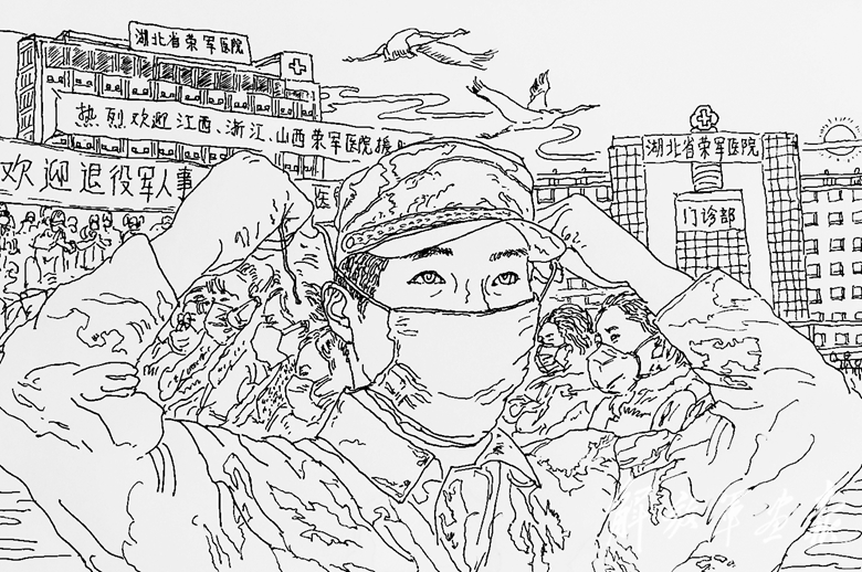 2020年1月23日,武漢因新冠肺炎疫情嚴重而封城。馬國旗和家人在武漢家中進行居家隔離,通過電視和網(wǎng)絡(luò),他關(guān)注著疫情防控工作的進展,時刻被抗擊疫情斗爭中涌現(xiàn)的英雄事跡感動著。出于一名老兵和畫家的自覺,他決定將眼中所見、心中所感畫出來,以表達自己內(nèi)心的崇敬。