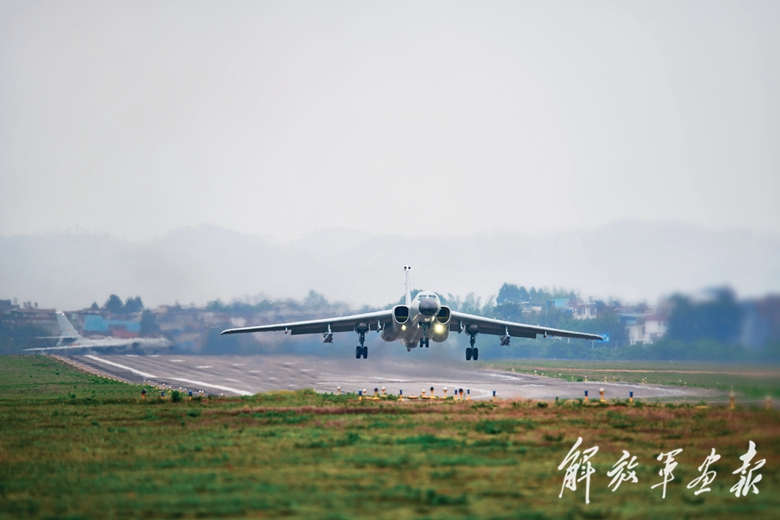 東部戰(zhàn)區(qū)空軍某師飛行員駕駛轟-6K戰(zhàn)機(jī)起飛待戰(zhàn)。(攝影/黃忠杰)