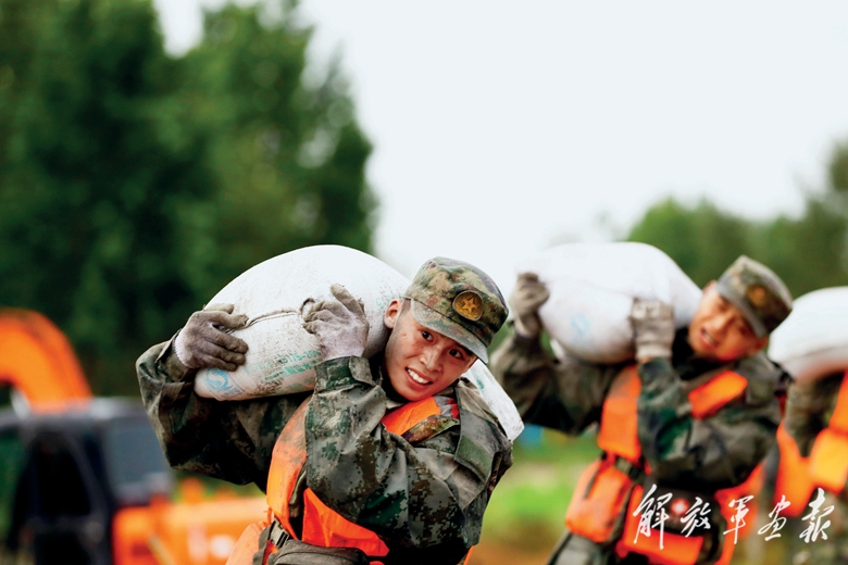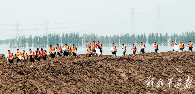 眼前是奔涌而來的洪流,身后是鱗次櫛比的樓房。咆哮的洪水一次次沖擊堤壩,年輕的官兵們一次次沖向大堤,手提肩扛、壘筑堤壩,連續(xù)奮戰(zhàn)17個(gè)小時(shí),裝填10萬余個(gè)沙袋,加固堤壩2500多米。洪峰過去,城鎮(zhèn)安然。