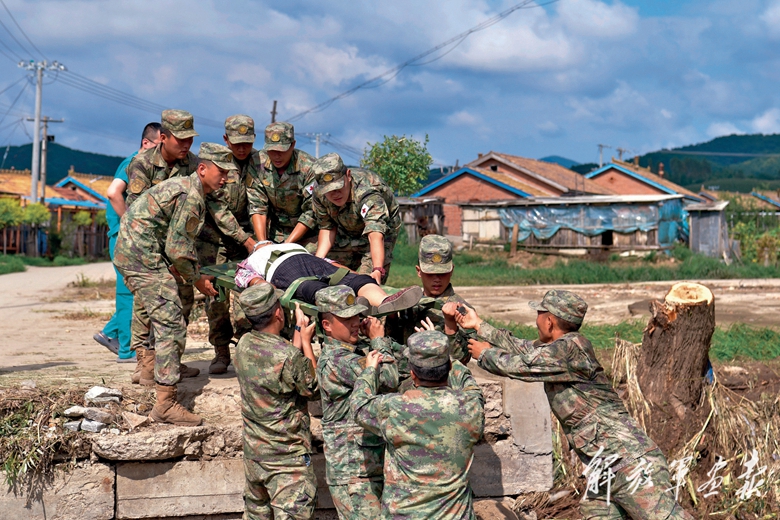 8月7日,北部戰(zhàn)區(qū)陸軍某旅官兵在吉林省舒蘭市七里鄉(xiāng)轉(zhuǎn)移受傷群眾。(攝影/劉 洋)