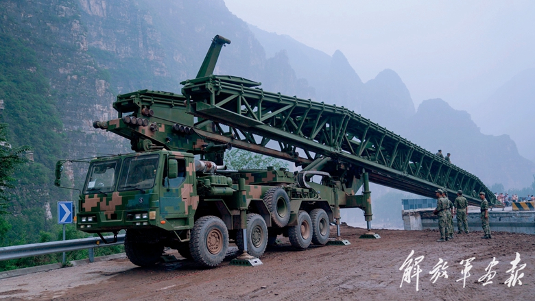 8月3日,陸軍第82集團(tuán)軍某工兵旅趕赴北京市房山區(qū)受災(zāi)地域架設(shè)重型支援橋,保證當(dāng)?shù)鼐用裾Mㄐ小#〝z影/萬端武)