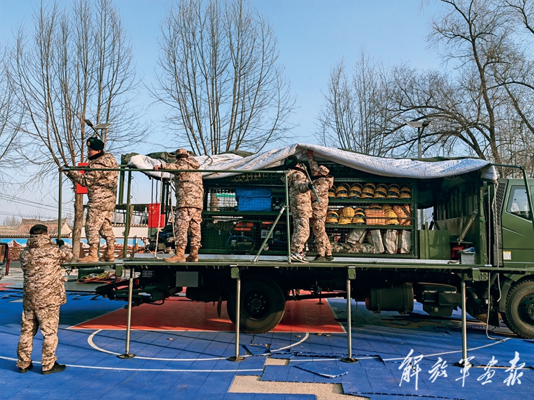 12月19日,武警甘肅總隊(duì)臨夏支隊(duì)救援隊(duì)利用綜合宿營(yíng)車為受災(zāi)群眾搭建車載帳篷。(攝影/石學(xué)鑫)