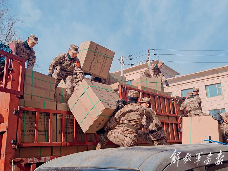 12月19日,武警甘肅總隊(duì)甘南支隊(duì)官兵到達(dá)救援地域后,迅速展開搬運(yùn)物資等工作。(攝影/劉亞斌)