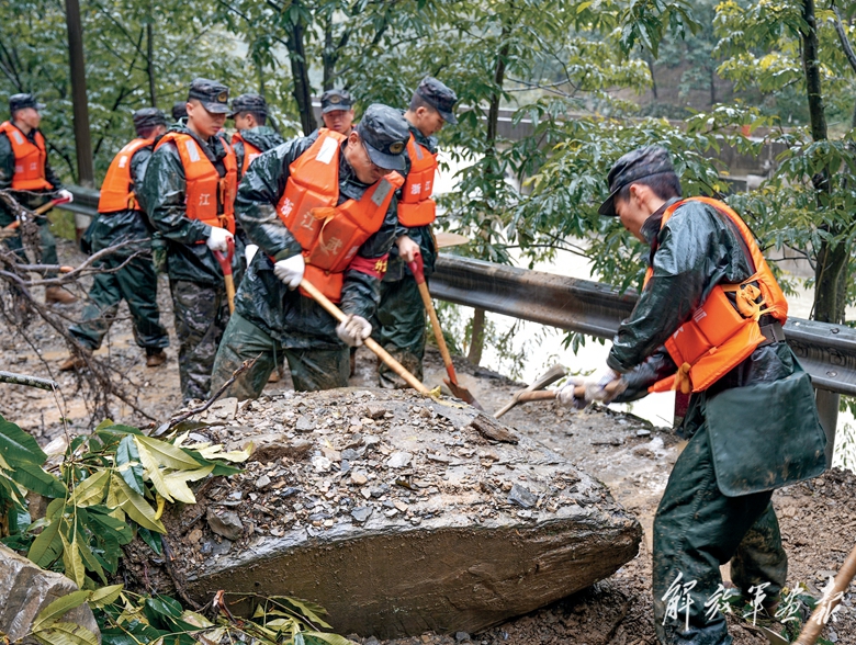 6月27日,武警浙江總隊(duì)杭州支隊(duì)黨員突擊隊(duì)在災(zāi)區(qū)疏通道路。(攝影/朱 勝)