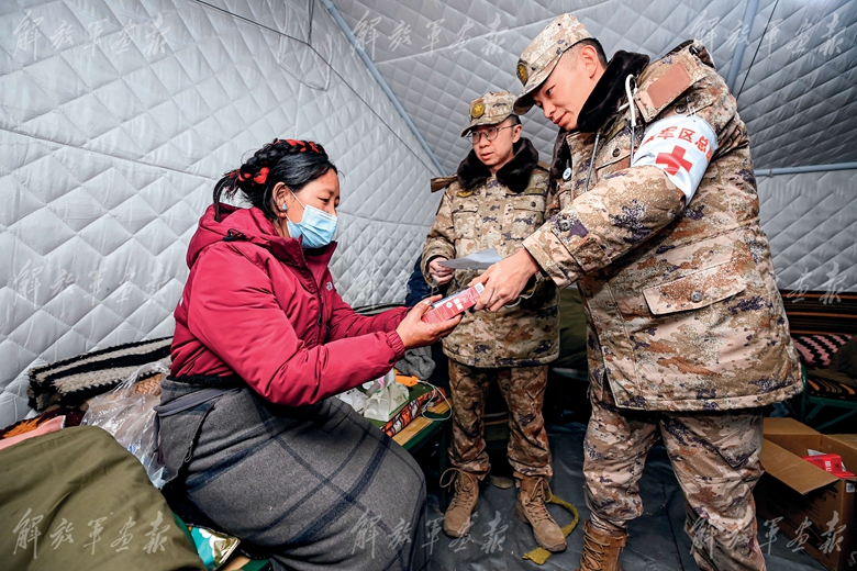 1月8日,西藏軍區(qū)總醫(yī)院醫(yī)療隊深入震區(qū)巡診送藥。(攝影/劉煜欽)