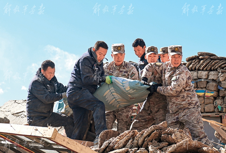 1月12日,武警西藏總隊日喀則支隊官兵在長所鄉(xiāng)古榮村清理廢墟。(攝影/何松濤)