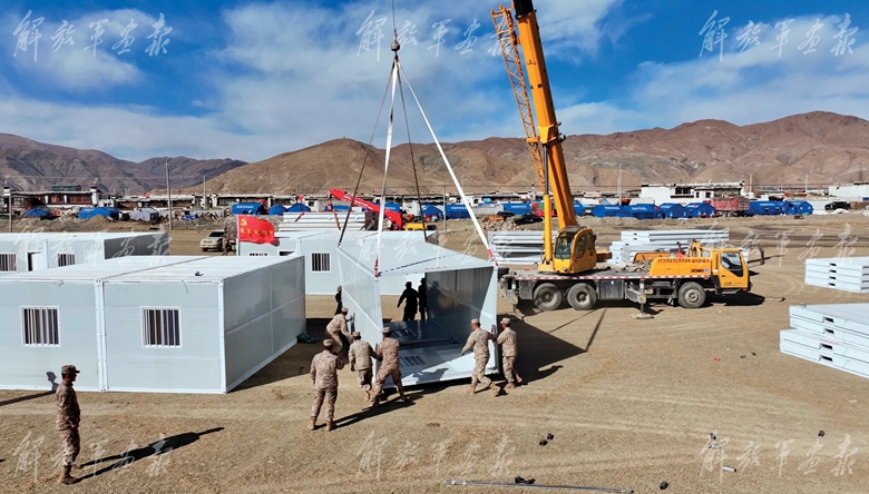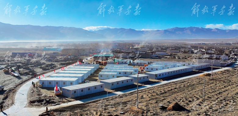 1月13日,西藏軍區(qū)某部官兵在拉孜縣拉孜鎮(zhèn)措布村幫助受災群眾搭建板房。(攝影/王 鵬)