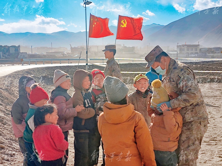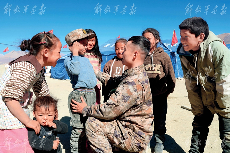 1月11日,在長所鄉(xiāng)雜村受災群眾安置點,西藏軍區(qū)某部戰(zhàn)士與孩子們暖心互動。(攝影/李建驕)