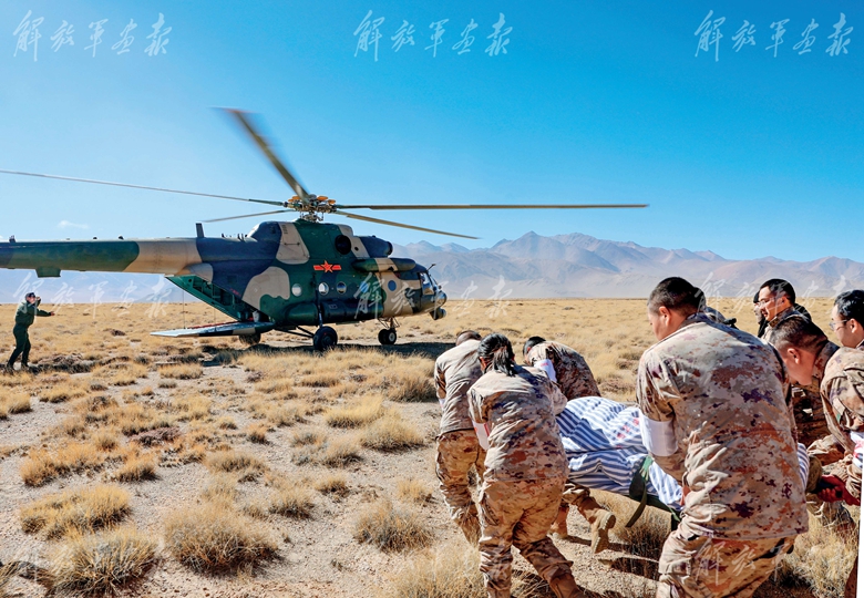 1月9日,西藏軍區(qū)某陸航旅派出直升機赴長所鄉(xiāng)執(zhí)行重傷員轉(zhuǎn)運任務。圖為醫(yī)護人員運送傷員登機。(攝影/胡其武)