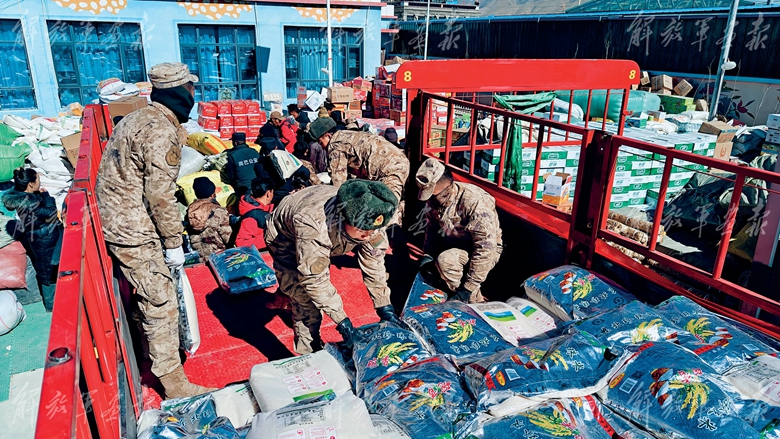 1月9日,武警西藏總隊官兵在長所鄉(xiāng)白朗村為受災群眾轉(zhuǎn)移物資。(攝影/李旭東)