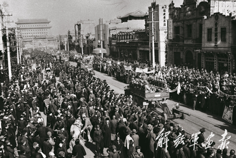 “1949年2月3日,人民解放軍舉行了規(guī)模盛大的入城式,我拍下了許多北平市民歡迎解放軍的動人場景。上午10時,人民解放軍舉行了莊嚴(yán)隆重的入城式,通過永定門進(jìn)入了珠市口——前門大街。兩旁的男女老少手持五顏六色的小旗,人人笑逐顏開,個個揚(yáng)眉吐氣,商店敞開大門,到處貼著歡迎人民解放軍的標(biāo)語。入城部隊(duì)行進(jìn)到正陽門和北平前門火車站一帶,而后從那里直接轉(zhuǎn)向東交民巷使館區(qū)。這里,在舊中國是帝國主義的天地,是中國國土上的‘國中之國’。中國的軍警不得進(jìn)入。而今,北平解放了,中國人民任人宰割欺凌的時代,和舊社會一樣,一去不復(fù)返了。中國人民解放軍從這里昂首闊步通過,宣告了帝國主義主宰中國的美夢徹底破滅?!?/p>